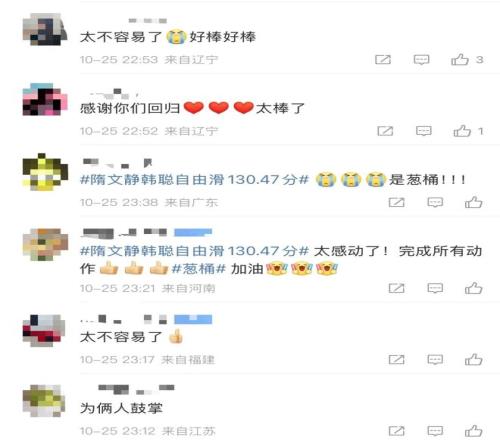 隋文静/韩聪在等分区 韩聪在赛后采访中坦言,为回归他严格节食减重,每天坚持高强度训练,“作为中国运动员,我们有责任和使命为祖国继续拼搏”。隋文静则笑称控制情绪是新课题:“太久没见这么多观众,兴奋到连站位都记错了,接下来要慢慢适应比赛节奏”。两人的复出获得全网盛赞,“伟大无须多言”“感谢回归”等评论刷屏,相关话题强势登顶微博体育热搜第一。