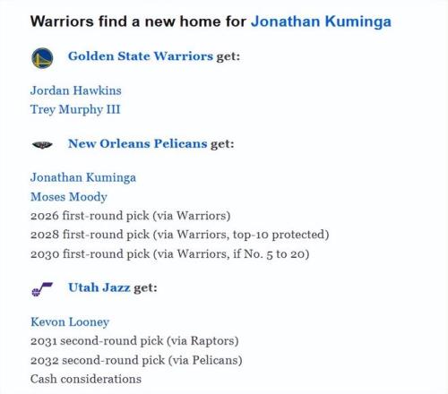 勇士队得到:霍金斯、墨菲 鹈鹕队得到:库明加、穆迪、2026年首轮签(来自勇士的无保护)、2028年首轮签(来自勇士,前10顺位保护)、2030年首轮签(来自勇士,顺位为5至20位时生效) 爵士队得到:卢尼、2031年次轮签(来自猛龙)、2032年次轮签(来自鹈鹕)、现金补偿 尽管勇士队在交易市场上与多位大牌球员传出绯闻,但结合球队的财务状况,交易得到墨菲才是更明智的选择。墨菲目前处于一份四年1.12亿美元续约合同的首个赛季,本赛季他的薪资占工资帽比例还不到浓眉的一半。勇士队通过这笔交易,甚至能节省2500万美元的奢侈税。 赛场层面,墨菲能为勇士队再添一位令对手忌惮的射手,与库里形成外线呼应。墨菲职业生涯的三分命中率达到38%,最近几个赛季场均能投进3记三分。而本赛季勇士队内三分命中数第二高的穆迪,场均仅能投进2.1记。从技术特点来看,墨菲在勇士队可以胜任侧翼防守,当格林出任中锋时,他还能顶到四号位,防守端的表现完全能跟上球队节奏。