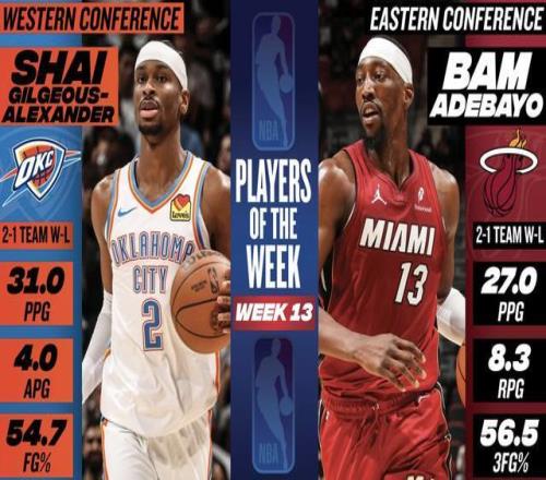 北京时间1月20日,NBA官方公布了最新一期东西部周最佳球员,雷霆球星谢伊-吉尔杰斯-亚历山大和热火球星巴姆-阿德巴约分别当选。