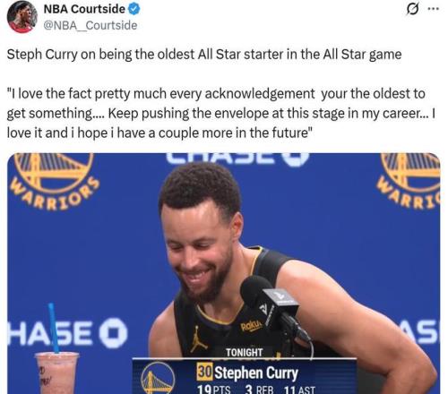 正是凭借这样的表现,库里在赛前成功入选全明星首发,西部另外四名首发是东契奇、亚历山大、约基奇和文班。 不难看出,本赛季球星新老更替明显,库里不仅是西部首发中唯一的美国本土球员,也是唯一入选的35岁以上老将,成为东西部全明星中最老首发球员。 赛后谈及这一话题,库里笑着说道:“我喜欢每一次获得认可都是因为我是年龄最大的那个,在生涯这个阶段,我还是会不断挑战自己,我喜欢这种感觉,希望未来还能获得更多这样的荣誉。”